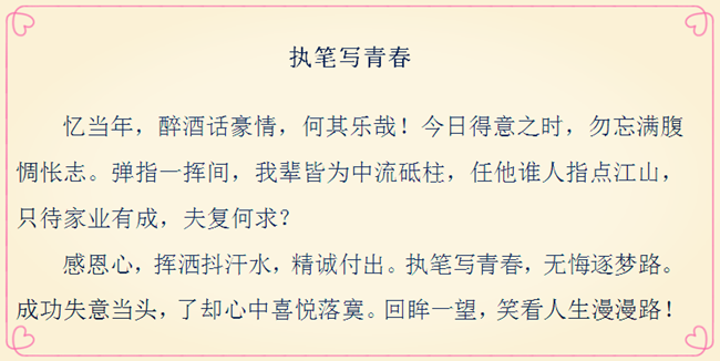 “現(xiàn)在,青春是用來奮斗的;將來,青春是用來回憶的?!碑斔械慕?jīng)歷化作記憶,那些年少時為理想揮灑的汗水,為成功付出的艱辛,終將成為彌足珍貴的人生財富。