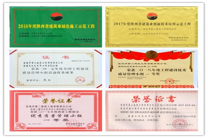 艱難困苦,玉汝于成。通過項目團(tuán)隊全體員工的共同努力,寶雞文化藝術(shù)中心項目先后被評為“2016年度寶雞市優(yōu)質(zhì)樣板主體工程”“2016年度陜西省建筑業(yè)綠色施工示范工程”“2016年度陜西省省級文明工地”“2017年度陜西省建筑業(yè)創(chuàng)新技術(shù)應(yīng)用示范工程”“2017年度陜西省建筑業(yè)優(yōu)質(zhì)結(jié)構(gòu)工程”;項目部先后榮獲全國工程建設(shè)質(zhì)量管理小組活動成果獎4項、陜西省工程建設(shè)優(yōu)秀QC小組成果獎7項,申報陜西省省級工法1項;項目部先后榮獲公司先進(jìn)黨支部、先進(jìn)單位、經(jīng)濟(jì)貢獻(xiàn)特別獎單位、“安康杯”安全文化知識競賽活動二等獎,規(guī)劃局系統(tǒng)先進(jìn)黨支部等榮譽。