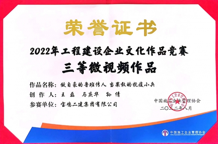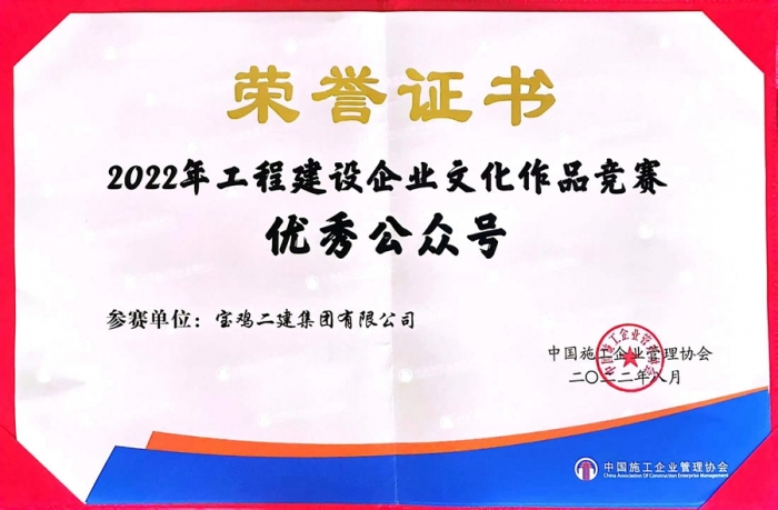 在喜迎二十大之際,中國(guó)施工企業(yè)管理協(xié)會(huì)在南寧隆重召開(kāi)2022年度工程建設(shè)企業(yè)文化成果交流會(huì),會(huì)議公布了2022年度工程建設(shè)企業(yè)文化作品競(jìng)賽評(píng)選結(jié)果,并進(jìn)行表彰。寶雞二建公眾號(hào)被評(píng)為“全國(guó)工程建設(shè)行業(yè)優(yōu)秀公眾號(hào)”,企業(yè)文化作品《做自豪的魯班傳人 當(dāng)果敢的抗疫小兵》微視頻榮獲三等獎(jiǎng)。